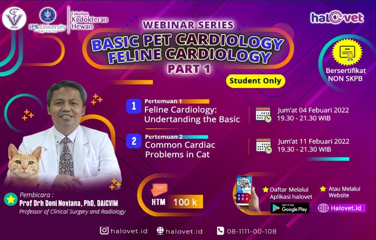 Kelainan jantung pada kucing dapat memicu gangguan kesehatan hingga menyebabkan kematian. Pemahaman tentang dasar-dasar keilmuan dibutuhkan untuk penegakan diagnosa dan menentukan terapi. HaloVet menghadirkan Webinar “Basic Pet Cardiology: Feline Cardiology” dengan narasumber Prof. Drh. Deni Noviana, Ph.D., DAiCVM (Profesor di bidang bedah dan radiologi FKH IPB).